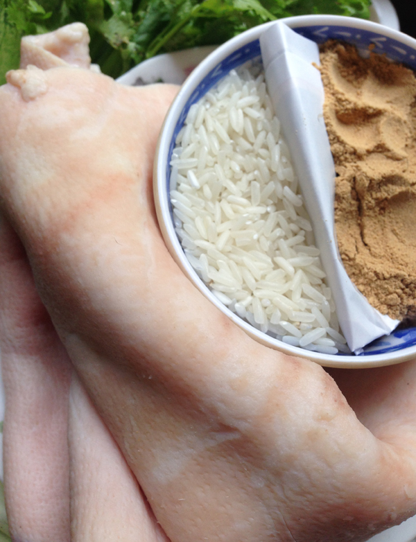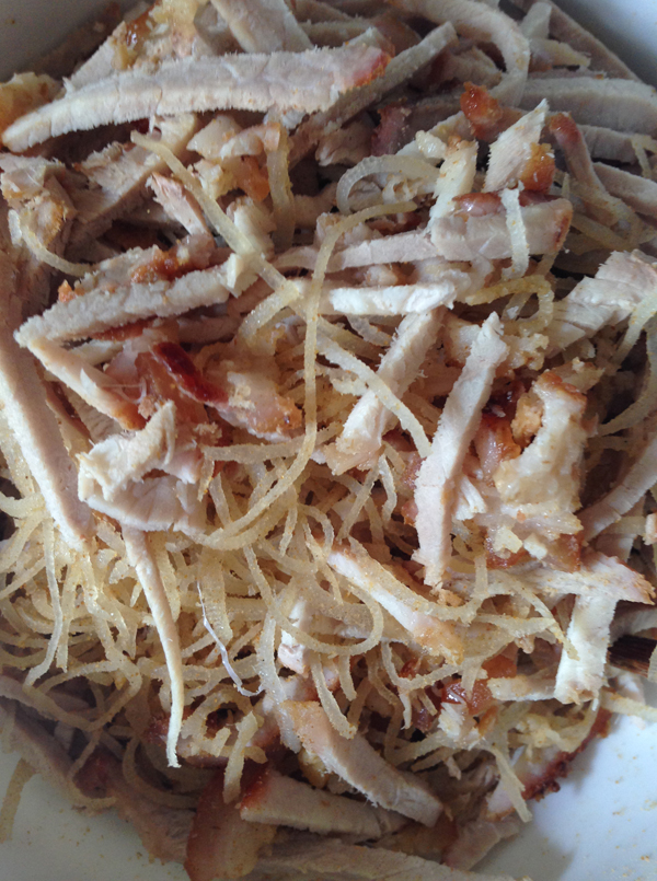 Da heo sach lông cạo trắng luộc chín, ngâm nước lạnh xong cắt sợi (càng nhuyễn càng ngon) và rửa lại để ráo trong rổ. Trộn da heo đã cắt sợi với thính một lượng vừa đủ.