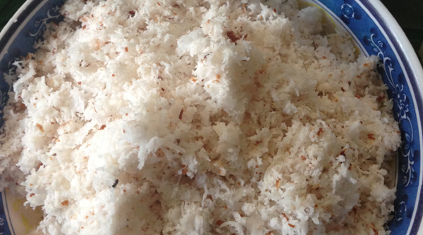 Cho 250ml nước ấm vào dừa nạo, nhồi mạnh và đều tay cho dừa ra hết nước cốt, sau đó dùng ray lọc bỏ xác dừa ta có nước cốt dừa. Tiếp tục cho khoảng 1 lít nước vào nhồi lần 2 rồi loại bỏ xác, vậy là được phần nước dão dừa để riêng ra.