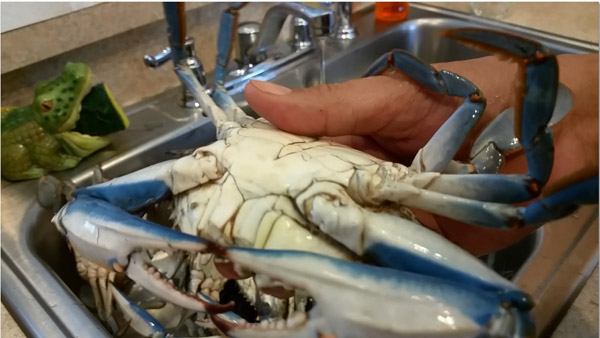 Chàng ghẹ “đứng hình” khi được bàn tay massage lên yếm. (Hình: Ngọc Lan/Người Việt)