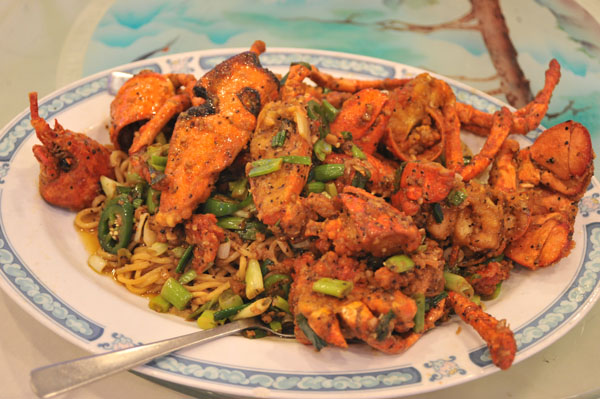 Món tôm hùm xào mì thật hấp dẫn. (Hình: Dân Huỳnh/Người Việt)