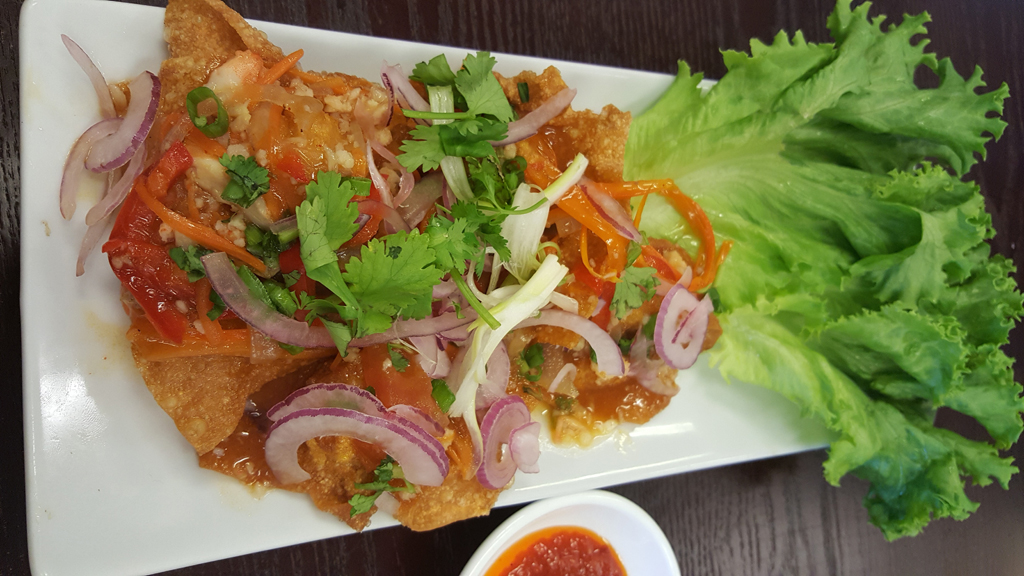 Bên trong miếng hoành thánh chiên giòn rụm, là viên nhân tôm thơm ngọt. Nhưng đặc biệt của món này không nằm ở đó, mà chính là ở nước xốt chan bên trên. Nét độc đáo của ẩm thực Việt nằm nhiều ở các loại nước chấm. Nước xốt này có thể xem là một nét độc đáo đó, với tôm, thịt, và cua băm nhuyễn, hòa trong đó có thêm cà chua đỏ, hành lá xanh, ít cà rốt thái sợi… Màu sắc đã góp phần làm tăng thêm nét tươi ngon của món ăn này.