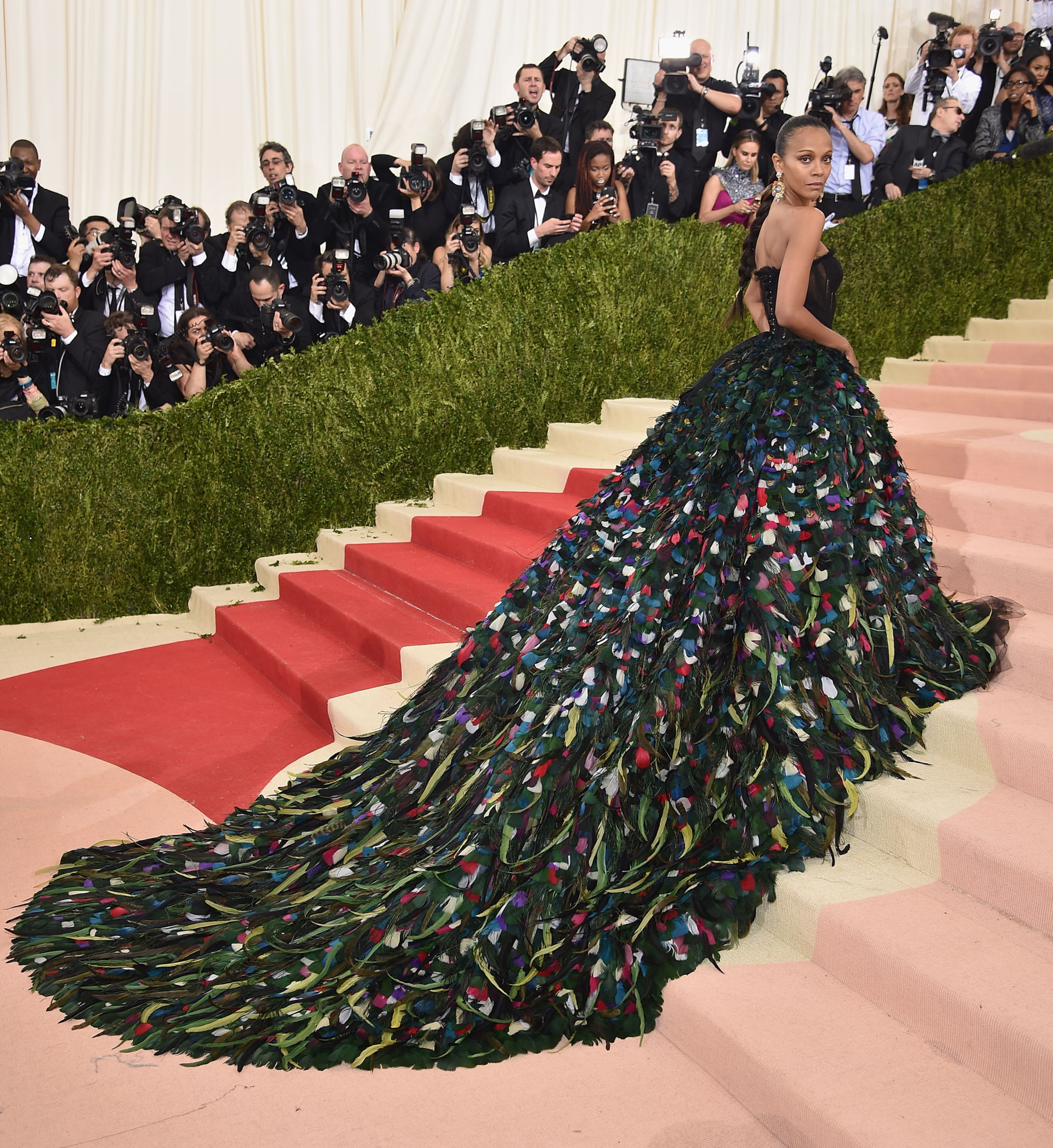 MET Gala năm 2016 với chủ đề “Manus x Machina: Fashion In An Age Of Technology” chào đón nữ diễn viên Zoe Saldana trong trang phục của thương hiệu Dolce & Gabbana. Đuôi váy được đính tinh xảo với hơn 20,000 lông vũ nhuộm các màu khác nhau tạo nên bộ cánh độc đáo và lạ mắt.