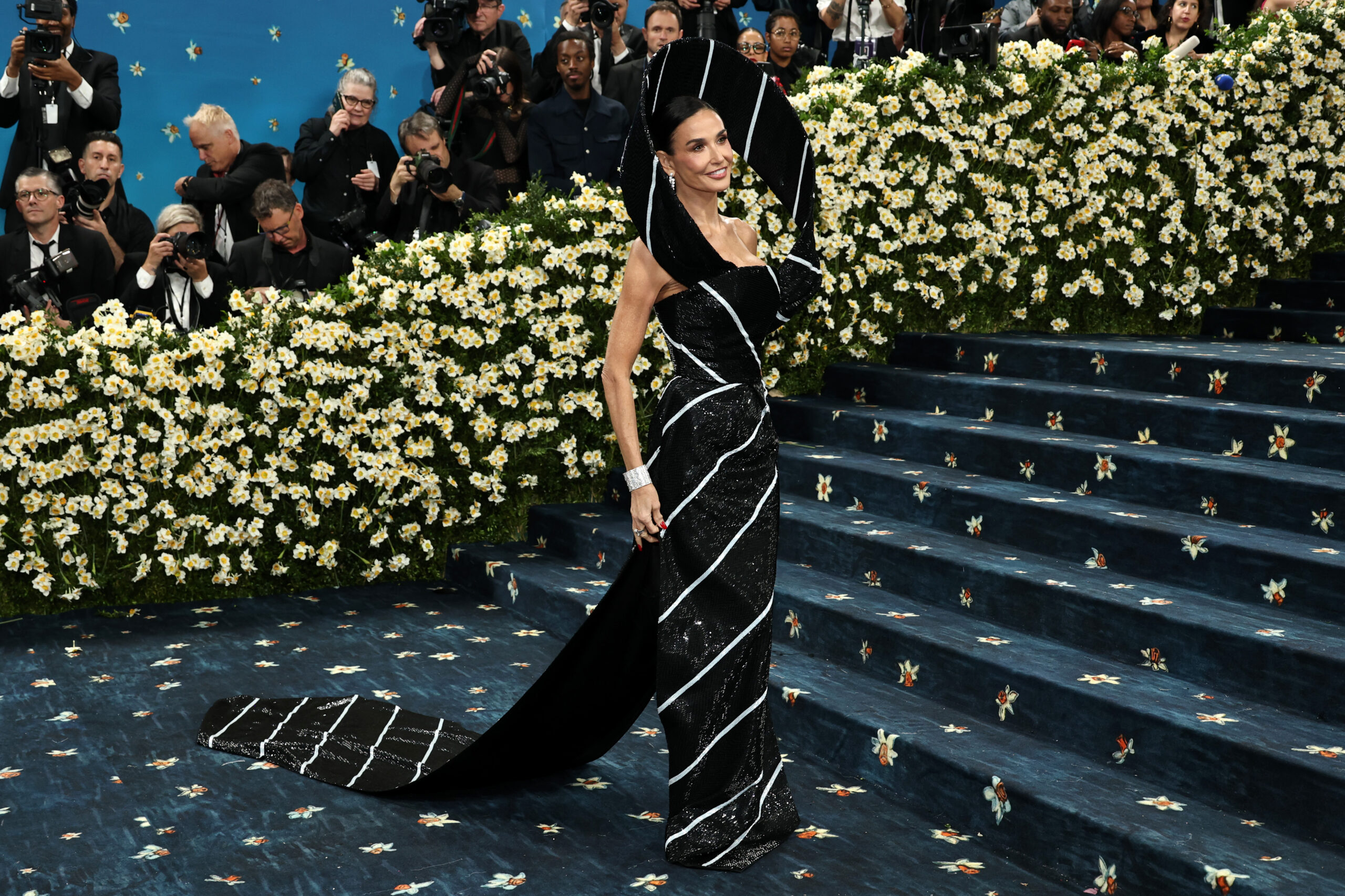 Minh tinh Demi Moore “hot” nhất trong năm qua với vai chính Elisabeth trong phim “The Substance” thu hút mọi ánh nhìn của người đối diện trong chiếc váy của nhà mốt Thom Browne, lấy cảm hứng từ chiếc cà vạt, với phần nút thắt tạo thành phần trên của bộ cánh còn phần thân của cà vạt kéo dài thành chiếc váy dài bồng bềnh.
