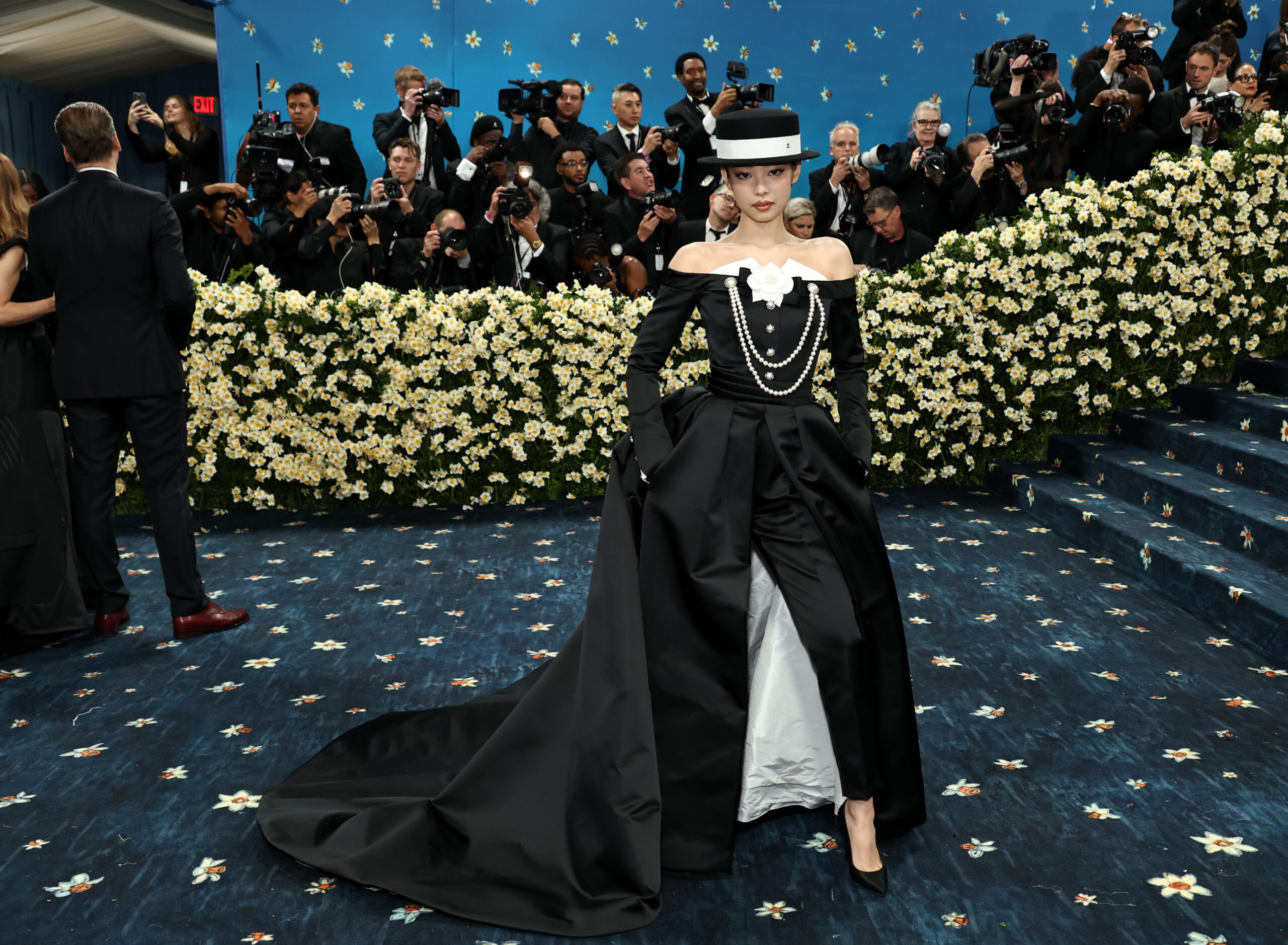 Bộ cánh của Jennie bao gồm một bộ jumpsuit đen trễ vai, được nhấn với các chuỗi ngọc trai và chiếc bông hoa camellia trắng, một biểu tượng đặc trưng của Chanel, với phần váy dài hai tông màu có thể tháo rời, tạo nên hiệu ứng thị giác ấn tượng cũng như đem lại sự linh hoạt cho trang phục.