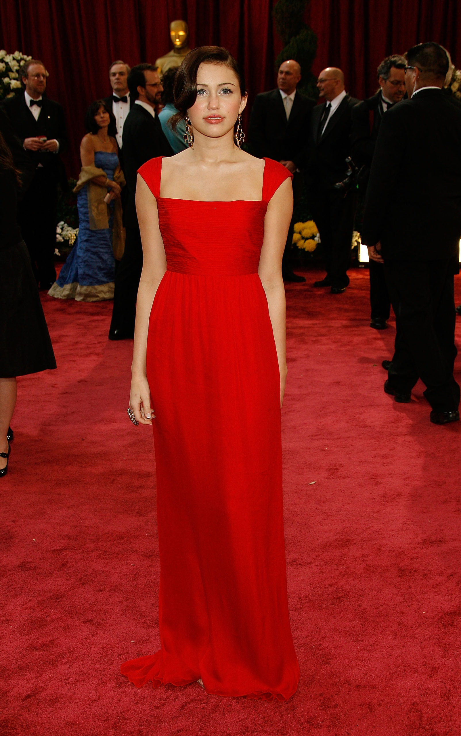 Lần đầu tiên có mặt tại thảm đỏ Oscar khi mới 15 tuổi, Miley Cyrus chọn chiếc đầm đỏ của Valentino, trở thành một thiếu nữ quý tộc sang trọng.