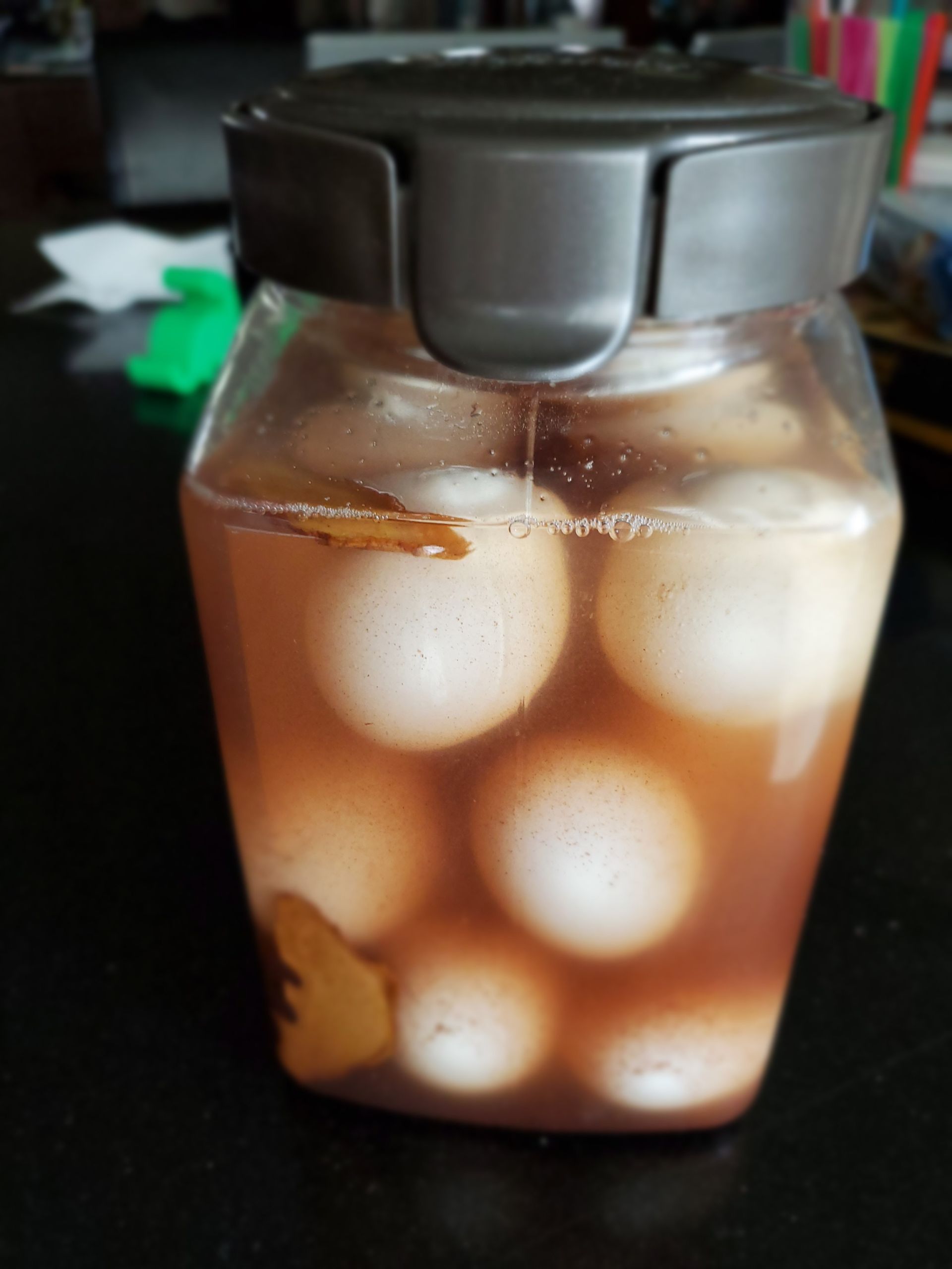 -Sắp trứng vào hủ, chế nước muối vào cho ngập trứng (có thể dùng bịch ziplock đựng nước để lên trên đè trứng xuống, không cho trồi lên khỏi mặt nước). Đậy nắp lại để yên trong 4 tuần là lòng đỏ trứng chín đỏ.