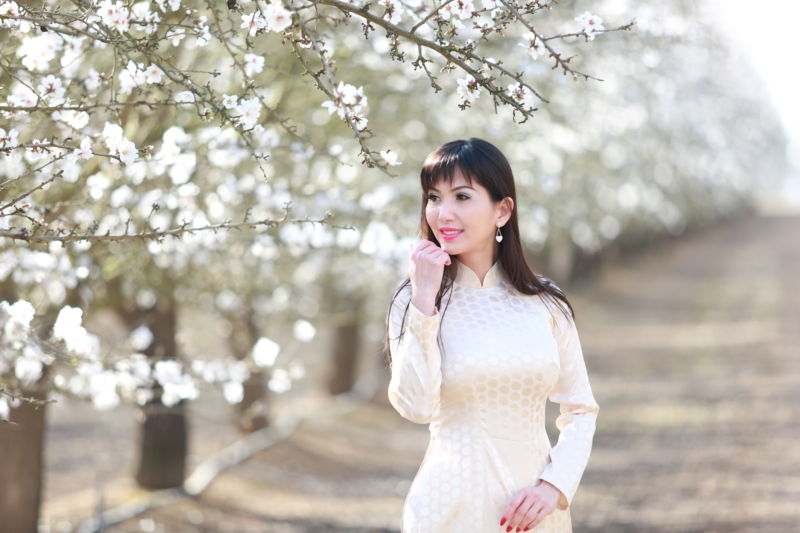 Tuy nhiên cây hạnh nhân này cũng xài khá tốn nước, trong khi tiểu bang Cali đang chịu nạn hạn hán mấy năm nay thì lúc nào cũng phải duy trì 10% lượng nước cho các trang trại hạnh nhân. Bây giờ hiện đại lắm, hệ thống tưới nước cho cây là hệ thống ngầm. Nên nhìn hình chụp mặt đất có vẻ khô ráo, mà bên dưới té ra rất ẩm. Khi các nàng mẫu điệu như tôi vừa nện giày cao gót đi vào vườn thì hỡi ôi, nó lún dần, lún dần đến khi mình… lùn xịt! Với khẩu hiệu hy sinh vì nghệ thuật, dù thời tiết giá lạnh căm và giày bị chôn dưới sình, mẫu điệu và thợ ảnh vẫn xuất sắc hoàn thành bộ ảnh, trong khi bác nông dân lái xe gì to đùng chạy tới chạy lui từng hàng cây nhưng lịch sự né hàng này ra cho du khách ẹo!