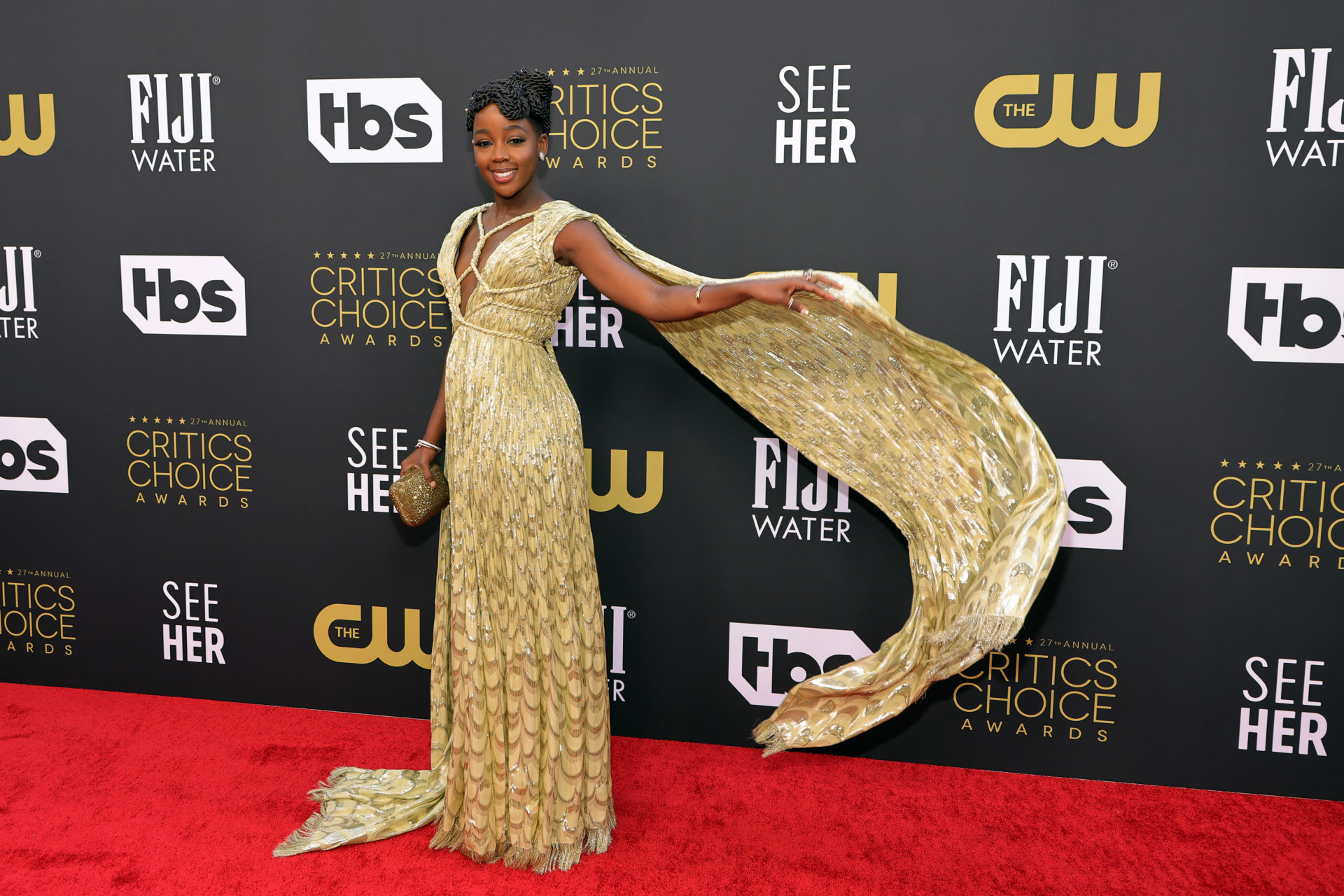 Đây là lần đầu tiên Thuso Mbedu có mặt tại Critic’s Choice Awards, chính vì vậy mà cô có sự lựa chọn và chuẩn bị kỹ lưỡng. Chiếc đâm ánh vàng đẹp mắt của thương hiệu Dior Haute Courture giúp Thuso Mbedu được dịp khoe dáng, tựa như nữ thần Hy Lạp bước đi trên thảm đỏ.