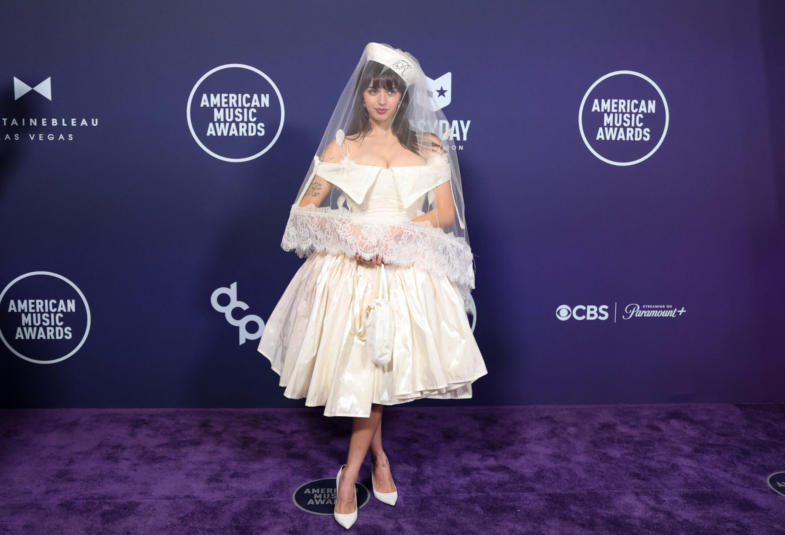 Rebecca Black đến với AMAs trong chiếc đầm trắng của nhà thiết kế Erick Charlotte. (Hình: Michael Tran/AFP via Getty Images)
