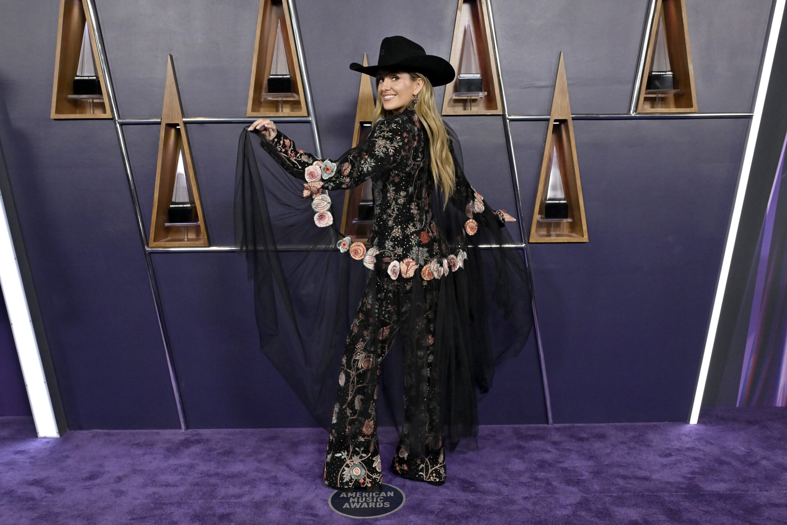 Bộ suit mà Lainey Wilson chọn được thêu hoa văn tinh xảo, được cô phối cùng với chiếc áo choàng sheer đen, tạo nên một điểm nhấn vừa lãng mạn và huyền bí, đi cùng với chiếc mũ cao bồi đặc trưng mà các nghệ sĩ dòng nhạc đồng quê hay chọn bên mình.