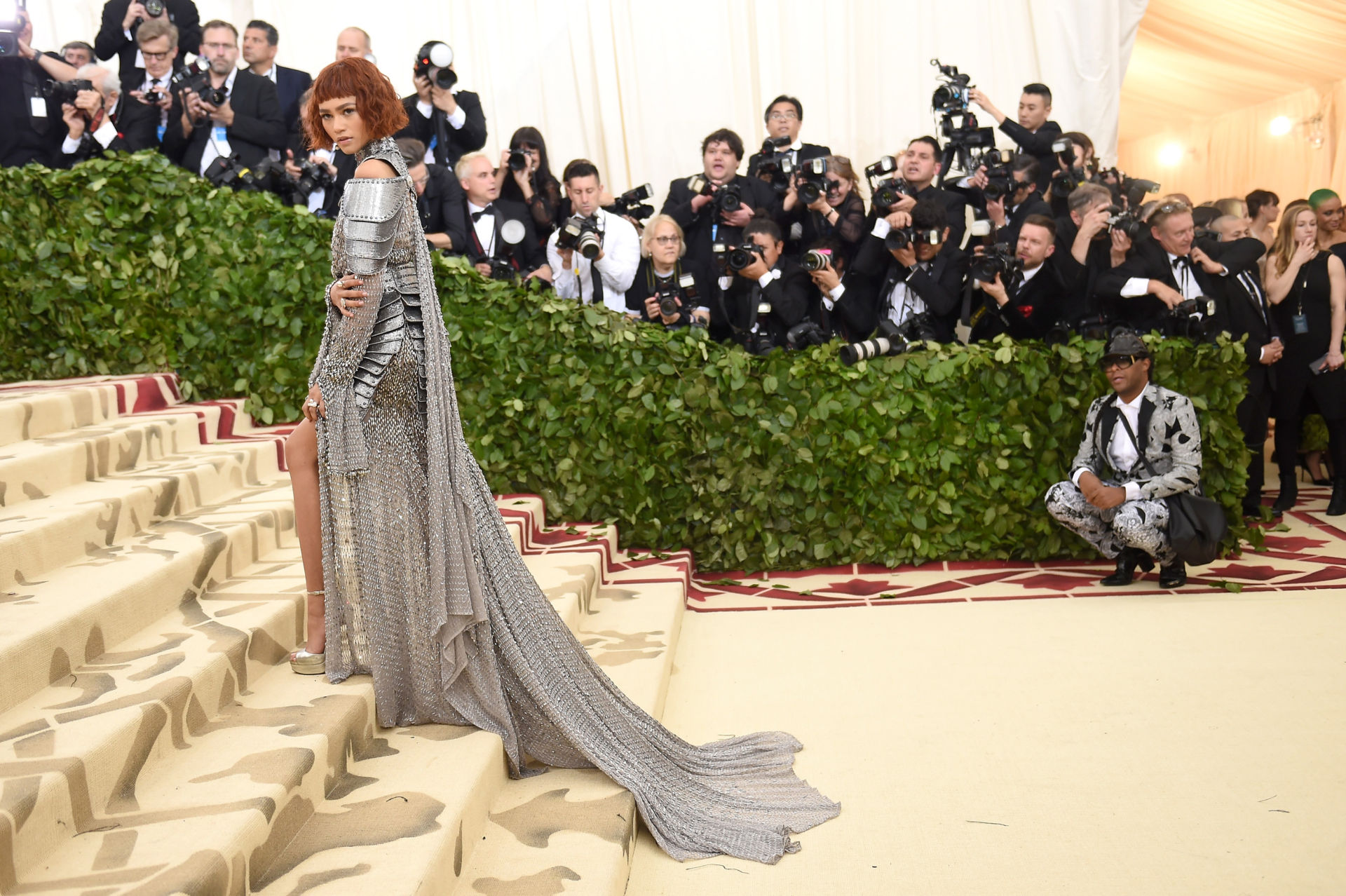 Với chủ đề “Heavenly Bodies: Fashion & The Catholic Imagination” tại MET 2018, Zendaya hóa thân thành hiệp sĩ đầy cá tính lấy cảm hứng từ nữ anh hùng Jeanne d’Arc thời La Mã xưa trong bộ cánh ánh bạc của thương hiệu Versace, kết hợp với kiểu tóc ngắn mái ngang so le lạ mắt.