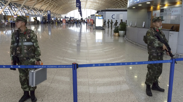 Cảnh sát cơ động gác phi trường Thượng Hải sau khi vụ nổ xảy ra. (Hình: AP Photo/Paul Traynor)