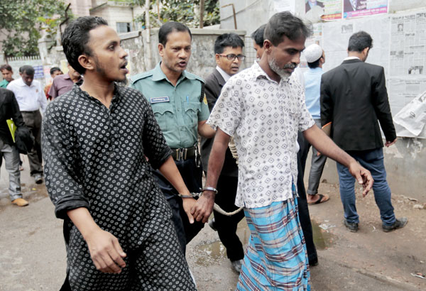 Hai người quá khích bị cảnh sát Bangladesh còng tay đưa đi. (Hình: AP Photo)