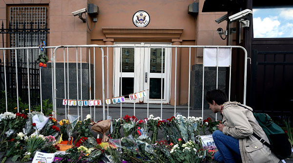 Tuy vậy, thật nhiều hoa và nến được đặt lại bên ngoài Tòa Đại Sứ Mỹ ở Moscow, một ngày sau khi Omar Mateen bắn gục 49 người tại một hộp đêm của người đồng tính ở Orlando, tiểu bang Florida.