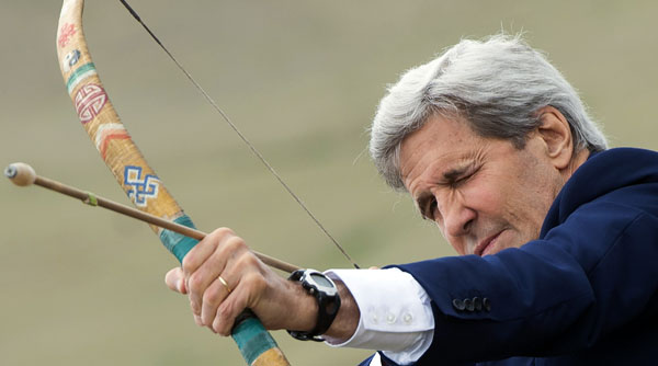 Ngoại trưởng John Kerry biểu diễn bắn cung tại lễ hội Naadam, Mông Cổ, 5 tháng Sáu. (Hình: Saul Loeb/Pool Photo via AP)