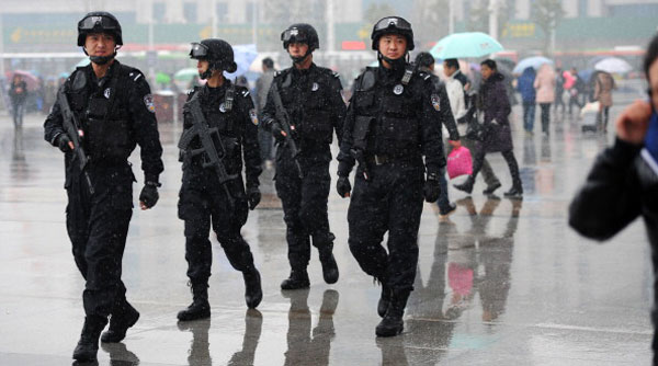 Cảnh sát đặc biệt Trung Quốc tuần tiễu ở Vũ Hán, Hồ Bắc. (Hình: Getty Images/China photos)