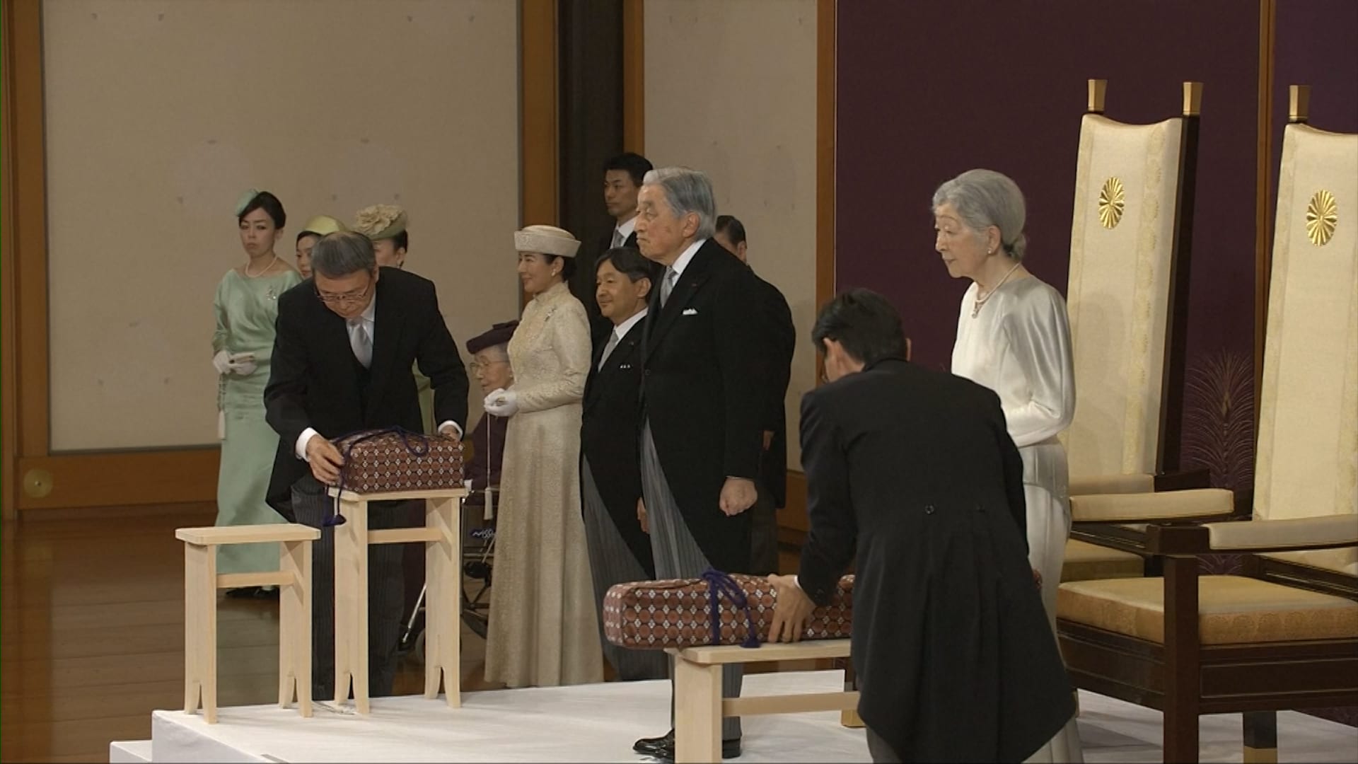 Trong bài viễn văn cuối cùng gửi đến toàn dân với tư cách nhà vua, Nhật Hoàng Akihito trao lại hai món bảo bối của Hoàng Gia là viên ngọc và gươm báu, và cảm ơn người dân đã ủng hộ ông suốt 30 năm trị vì.