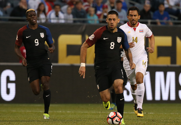 Tiền vệ tuyển Hoa Kỳ, Clint Dempsey số 8 dẫn banh trước sự theo đuổi truy cản của cầu thủ áo trắng số 14 của Costa Rica trong trận đấu giữa hai đội diễn ra tại Chicago, Illinois ngày 7 tháng 6, 2016. (Hình: Getty Images)