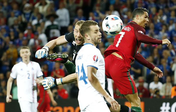 Tiền đạo Bồ Ðào Nha Ronaldo (phải) nhảy lên tranh bóng cùng với hậu vệ Iceland Kari Amason (phải) và thủ môn Halldorsson của Iceland trong trận đấu bảng F, Euro 2016, giữa Bồ Ðào Nha và Iceland diễn ra tại Saint-Etienne, ngày 14 tháng 6, 2016. (Hình: Getty Images)
