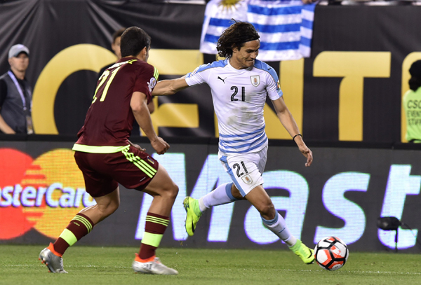 Tiền đạo Edinson Cavani (phải) của đội tuyển Uruguay dẫn banh trước sự truy cản của cầu thủ tuyển Venezuela trong trận đấu bảng C giải Copa America 2016 giữa hai đội tại Philadelphia, Pennsylvania ngày 9 tháng 6, 2016. (Hình: Getty Images)