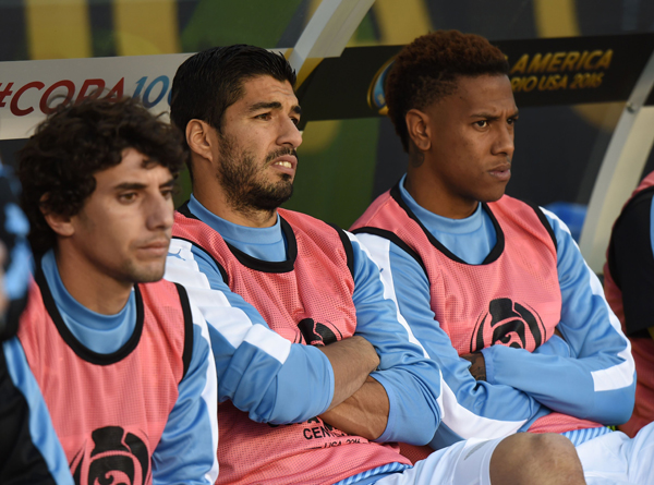 Tiền đạo đội tuyển Uruguay, Suarez (giữa), do chấn thương chưa bình phục hoàn toàn nên chỉ ngồi ghế dự bị trong trận đấu bảng C giữa Uruguay và Venezuela diễn ra tại Philadelphia, Pennsylvania ngày 9 tháng 6, 2016. (Hình: Getty Images)