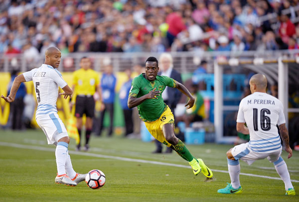 Cầu thủ JeVaughn Watson (giữa) của Jamaica đi bóng qua hai cầu thủ Uruguay. (Hình: Thearon W. Henderson/Getty Images)