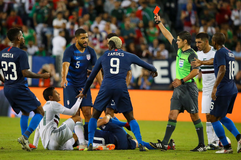 Angel Zaldiva số 14 của Mexico nhận thẻ đỏ khi vào bóng truy cản thô bạo với cầu thủ Mỹ Wil Trapp trong trận cầu quốc tế giao hữu giữa đội tuyển Hoa Kỳ và Mexico diễn ra tại Nissan Stadium, Nashville, Tennessee, ngày 11 Tháng Chín, 2018. (Hình: Getty Images)