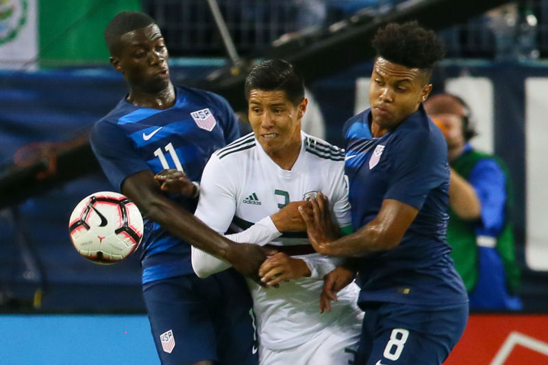 Tim Weah số 11 và Weston McKennie số 8 của Hoa Kỳ “kèm kẹp” sát cầu thủ Hugo Ayala số 3 của Mexico trong hiệp đầu của trận cầu quốc tế giao hữu giữa đội tuyển Hoa Kỳ và Mexico diễn ra tại Nissan Stadium, Nashville, Tennessee, ngày 11 Tháng Chín, 2018. (Hình: Getty Images)