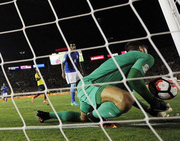 Thủ môn Brazil Alisson Becker của Brazil bắt bóng không dính để banh lọt vào khung thành nhưng trọng tài từ chối bàn thắng này của Ecuador cho rằng banh ở trong tình trạng ra khỏi lằn vôi cuối sân trong trận đấu giữa Brazil và Ecuador. (Hình: Getty Images)