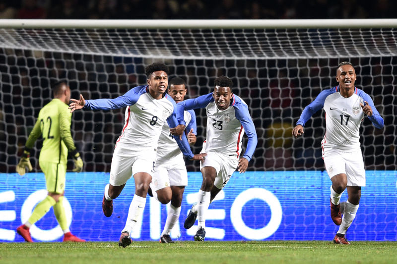 Tiền vệ trẻ Hoa Kỳ Weston McKennie (thứ hai từ trái) bày tỏ sự vui mừng khi ghi bàn thắng vào lưới Bồ Đào Nha trong trận cầu giao hữu giữa Bồ Đào Nha và Hoa Kỳ diễn ra tại Estadio Municipal Leiria, Leiria, Bồ Đào Nha ngày 14 Tháng Mười Một, 2017. (Hình: Getty Images)