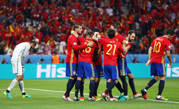 Các cầu thủ Tây Ban Nha vui mừng sau khi ghi bàn thắng vào lưới Thổ Nhĩ Kỳ trong trận đấu bảng D Euro 2016 giữa hai đội Tây Ban Nha và Thổ Nhĩ Kỳ diễn ra trên sân Allianz Riviera Stadium, Nice ngày 17 tháng 6, 2016. (Hình: Getty Images)