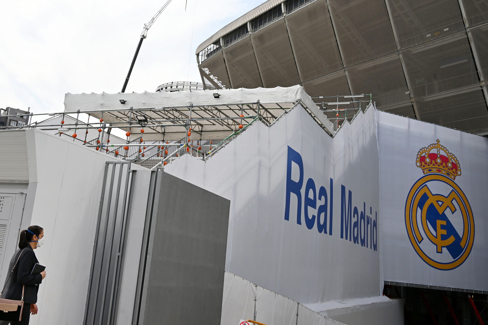 Một phụ nữ mang khẩu trang đến sân Santiago Bernabeu tại thành phố Madrid ngày 12 Tháng Ba, 2020, trong khi các cầu thủ đội bóng Real Madrid bị cách ly vì sự lan rộng của COVID-19. La Liga hiện ngưng vô hạn định vì Tây Ban Nha là quốc gia đứng sau Ý bị ảnh hưởng nặng nhất của COVID-19. (Hình: Gabriel Bouys/AFP via Getty Images)