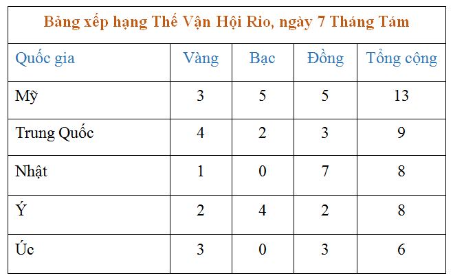 Các tin thể thao khác tại Thế Vận Hội Rio bao gồm:
