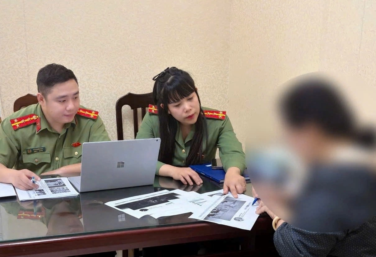 Bà LBN (bìa phải) tại đồn công an. (Hình: Công An Hà Nội).