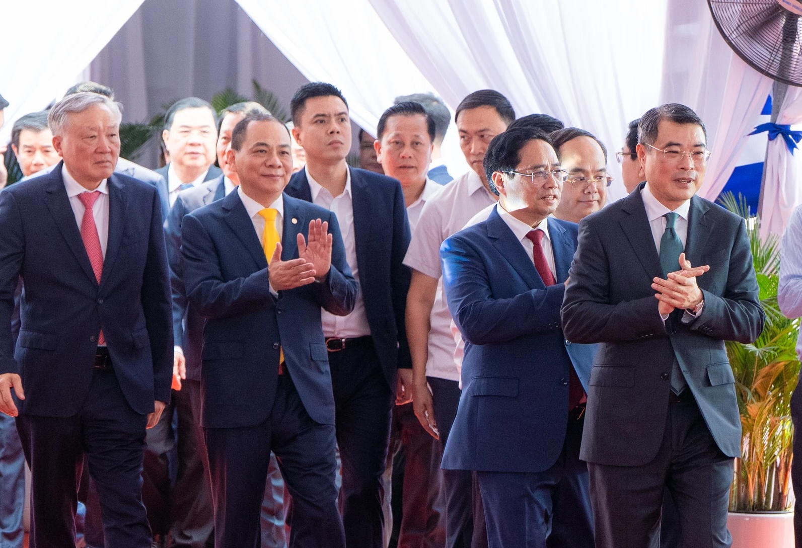 Từ phải, ông Lê Minh Hưng (thủ tướng Việt Nam), ông Phạm Minh Chính (cựu thủ tướng), ông Phạm Nhật Vượng (chủ tịch tập đoàn Vingroup), và ông Nguyễn Hòa Bình (cựu phó thủ tướng thường trực). (Hình: Pháp Luật TP.HCM).