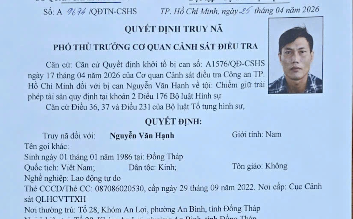 SÀI GÒN, Việt Nam (NV) – Bị can Nguyễn Văn Hạnh, 40 tuổi, quê Đồng Tháp, bị Công An TP.HCM truy nã với cáo buộc nhận chuyển khoản nhầm 495 triệu đồng ($18,778) hồi cuối năm 2024 nhưng rút ra tiêu xài rồi bỏ trốn.