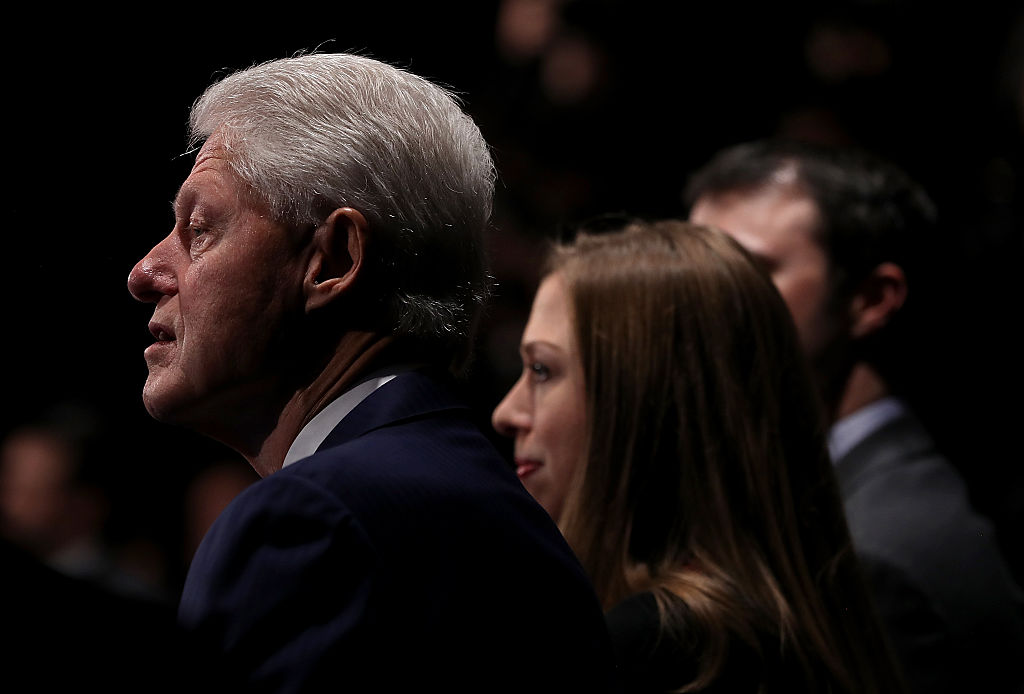 Cựu tổng thống Bill Clinton và con gái Chelsea có mặt tại buổi tranh luận. (Hình: Getty Images)