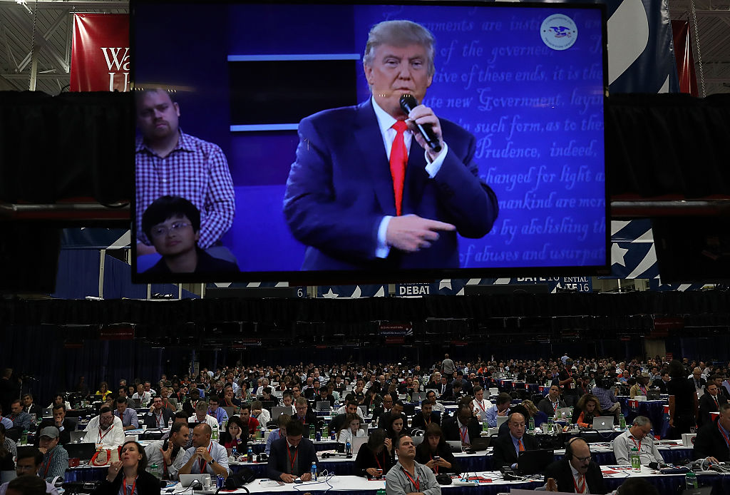 Các nhà báo làm việc tường thuật ngay tại cuộc tranh luận. (Hình: Getty Images)