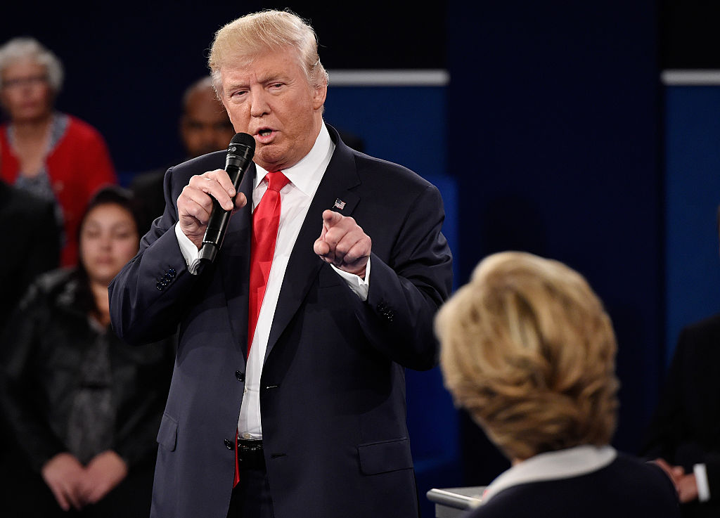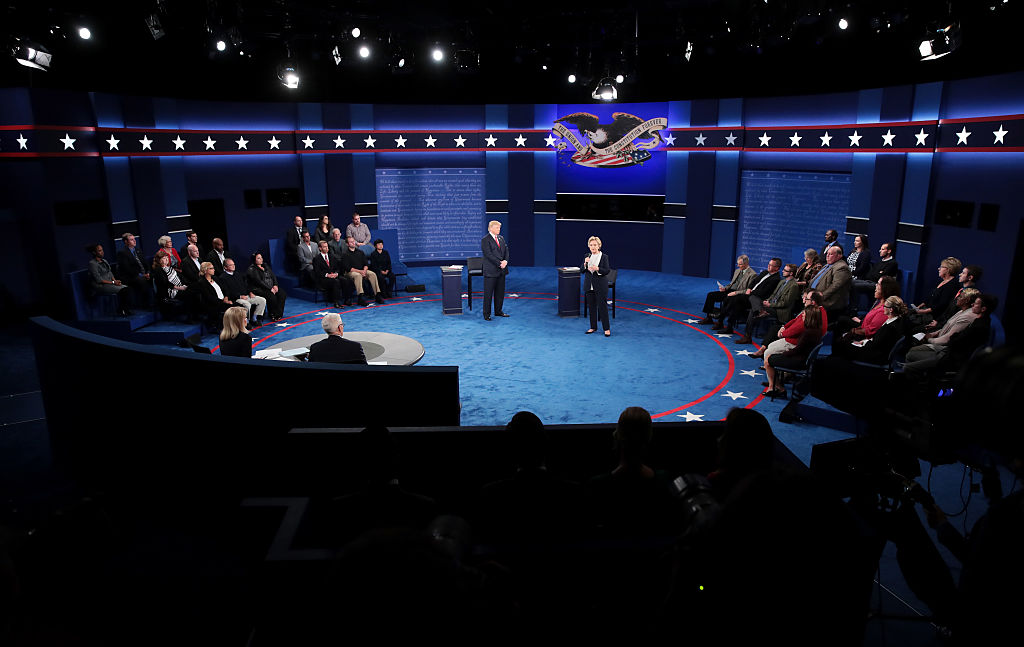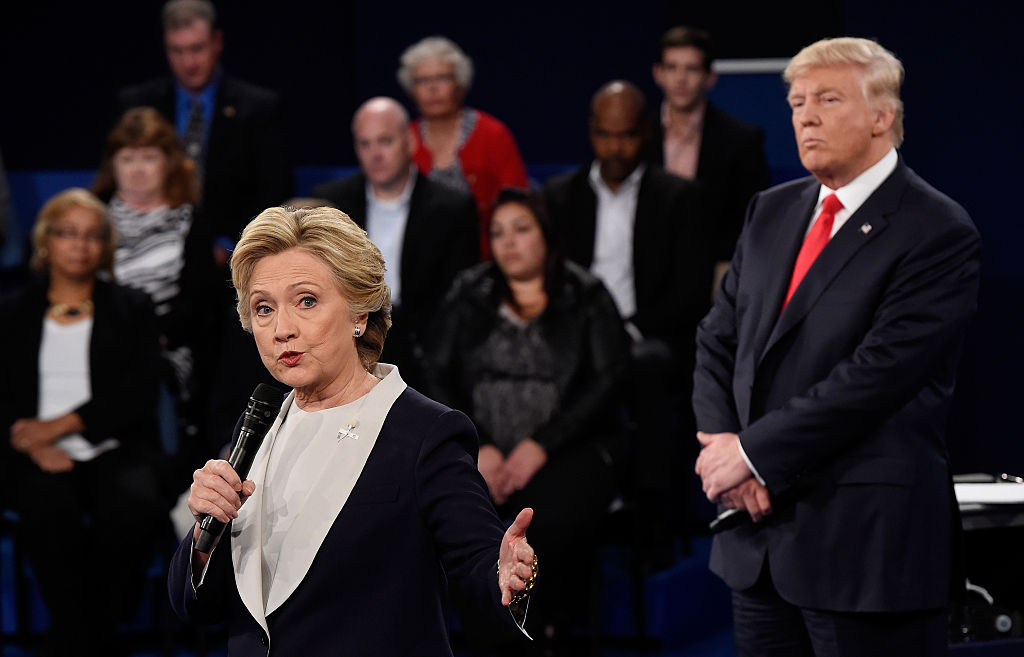 ST LOUIS, MO - OCTOBER 09: Democratic presidential nominee former Secretary of State Hillary Clinton (R) and Republican presidential nominee Donald Trump speak during the town hall debate at Washington University on October 9, 2016 in St Louis, Missouri. This is the second of three presidential debates scheduled prior to the November 8th election. (Photo by Chip Somodevilla/Getty Images)
