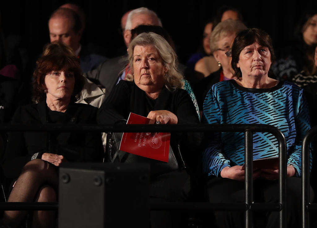 ST LOUIS, MO - OCTOBER 09: (L-R) Kathleen Willey, Juanita Broaddrick and Kathy Shelton look on during the second presidential debate with democratic presidential nominee former Secretary of State Hillary Clinton and republican presidential nominee Donald Trump at Washington University on October 9, 2016 in St Louis, Missouri. This is the second of three presidential debates scheduled prior to the November 8th election. (Photo by Justin Sullivan/Getty Images)