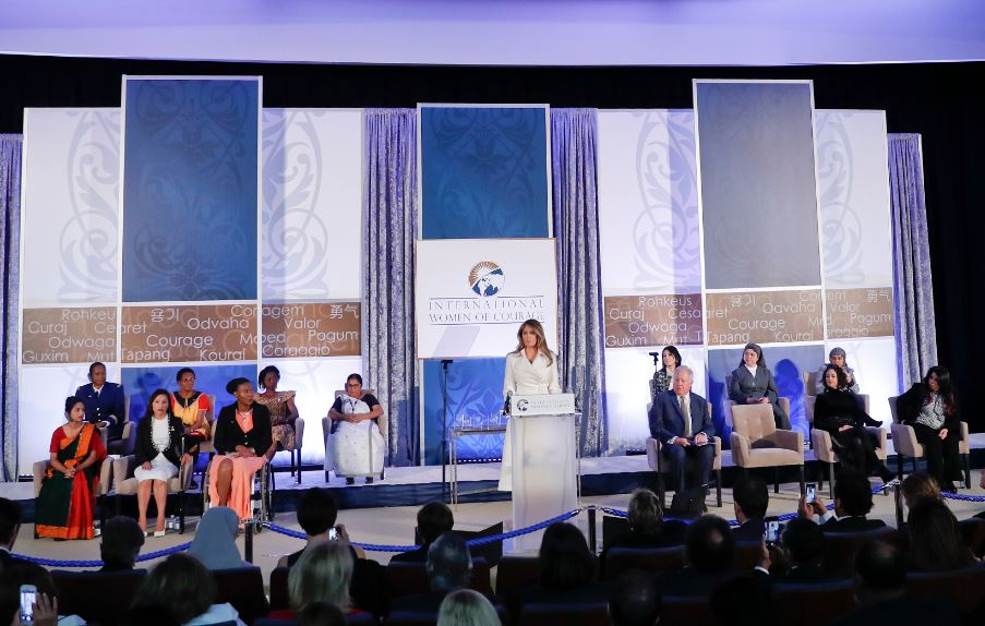 Trong phần phát biểu, Đệ Nhất Phu Nhân Melania Trump hỏi người tham dự đa số là phụ nữ hãy tưởng tượng bất cứ người nào trong 13 phụ nữ anh hùng đứng trên sân khấu với bà.