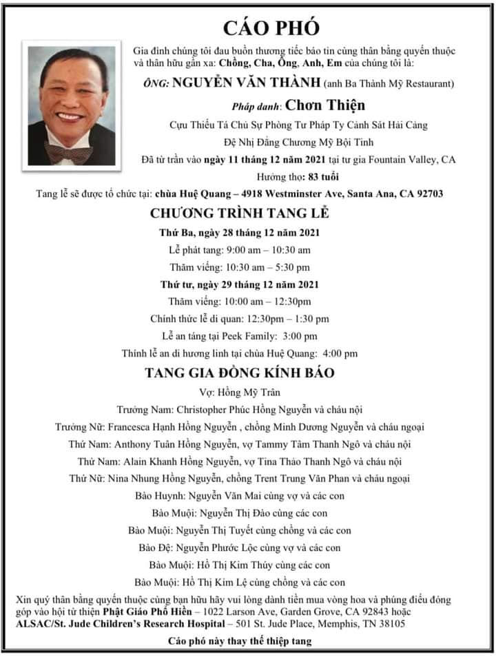 Cả gần một năm, từ ngày đại dịch COVID-19 hoành hành ở Mỹ và thế giới, nhà hàng Thành Mỹ đóng cửa, mãi đến gần đây mới hoạt động bình thường trở lại. Lần cuối tôi được gặp lại anh ở nhà hàng, cũng đã lâu, anh có vẻ yếu sức lắm. Anh vẫn vui vẻ ôm vai tôi và hỏi “Nhi khỏe không em? Sao không ra đây chơi với anh?” Anh vẫn quý trọng tình bằng hữu, huynh đệ, dù tôi chưa phải là một người em quá thân.