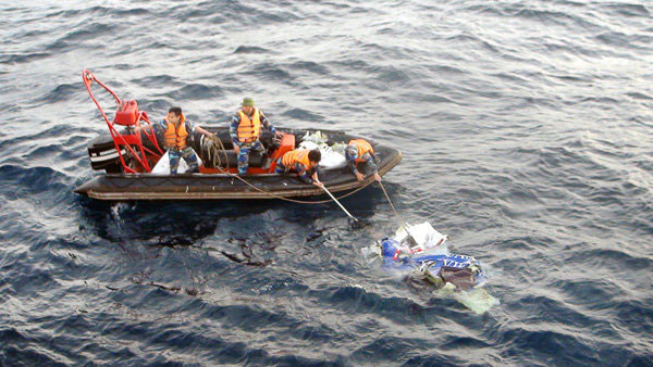Vớt mảnh vỡ máy bay CASA 212 bị nạn. (Hình: Cảnh Sát Biển Việt Nam)