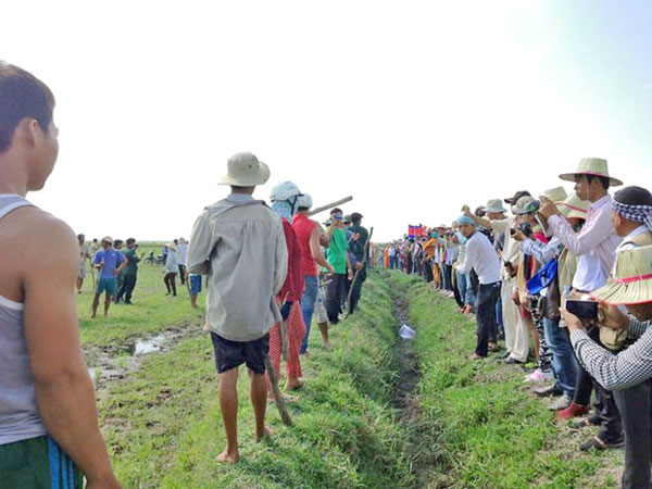 Người Việt dàn hàng ngang (bên trái) ngăn một phái đoàn kiểm tra biên giới của Cambodia (bên phải) băng qua nơi được xem là biên giới Việt Nam-Cambodia. (Hình: RFA)
