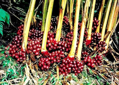 Cụm hoa có màu đỏ nhạt mọc từ gốc, dài 13-20cm. Trên mỗi bông có từ 8-17 quả, khi chín màu đỏ nâu bóng nhẵn, vỏ ngoài dày 5mm. Trong quả chia thành 3 ngăn, mỗi ngăn có khoảng 7 hạt có áo hạt hình tháp ép vào nhau mùi rất thơm.