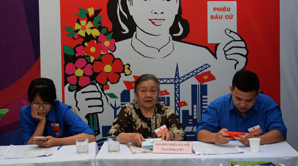Hai đoàn viên “đoàn thanh niên Cộng Sản” ngồi chơi với máy điện thoại trong khi bà cụ ngồi ở phòng bỏ phiếu rảnh rỗi chẳng có gì làm. (Hình: Hoang Dinh Nam/AFP/Getty Images)