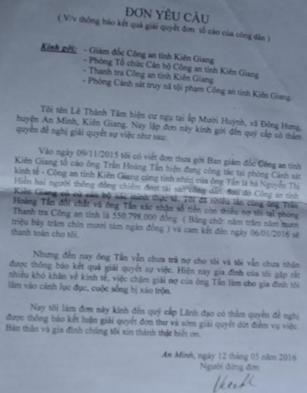Một trong nhiều đơn gửi đến ngành chức năng tố cáo ông Tấn. (Hình: Báo Đất Việt)