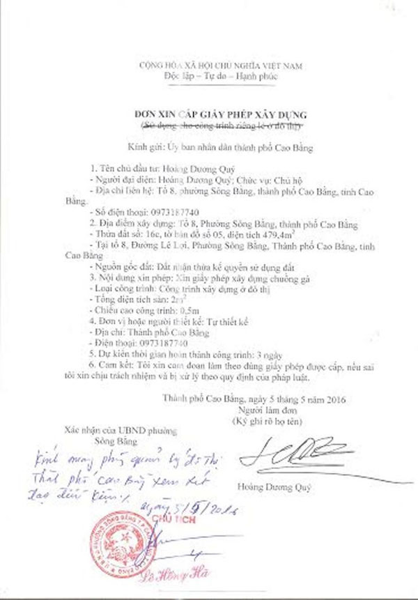 Ðơn xin phép xây chuồng gà của ông Quý, có bút phê của phường. (Hình: soha)