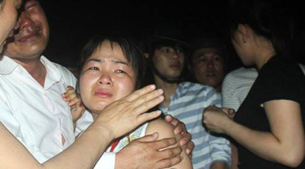Chị Nguyễn Thị Huyền, một nạn nhân sống sót trong vụ lật tàu, khóc lả vì 2 cháu mất tích. (Hình: VnExpress)