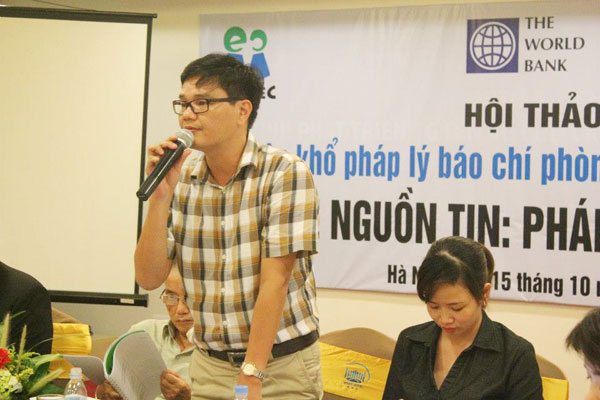 Nhà báo Mai Phan Lợi phát biểu tại cuộc hội thảo về báo chí do Ngân Hàng Thế Giới tổ chức. (Hình: FB Mai Phan Lợi)